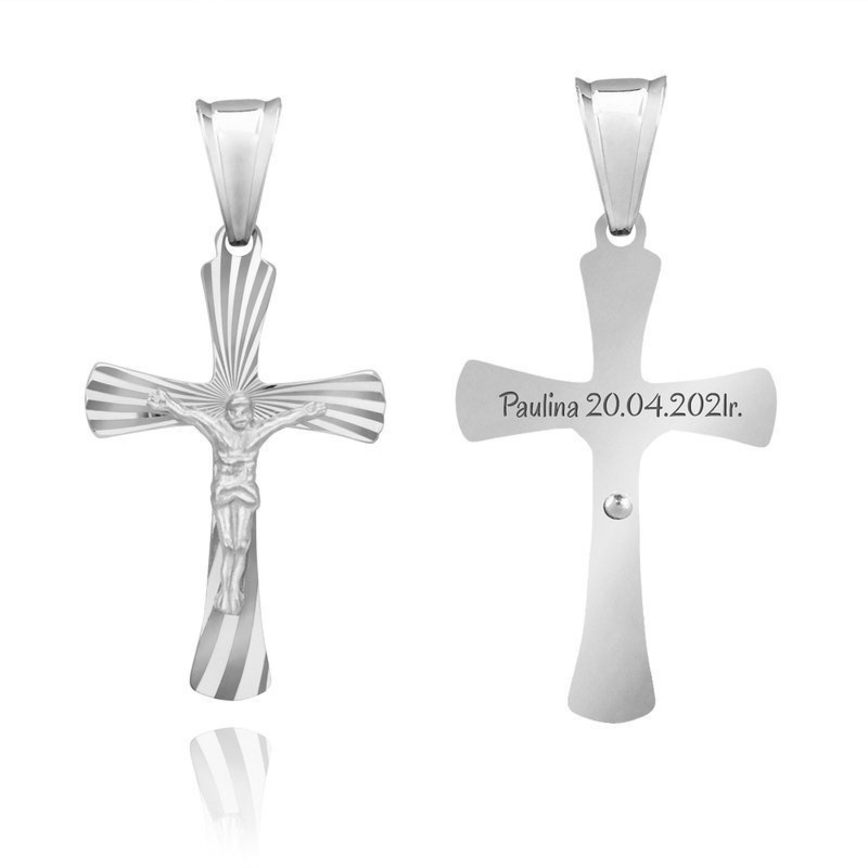 Krzyżyk z Jezusem ze srebra próby 0,925 z grawerem imienia i daty na rewersie, na Chrzest, Komunię i Bierzmowanie