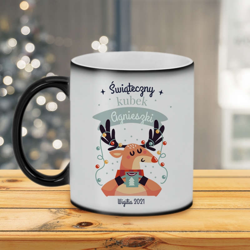 Prezent pod choinkę powinien cieszyć. Dlatego często nie możemy zdecydować się co kupić biskim. Mamy na to rozwiązanie! Sprawdzonym pomysłem na prezent na Święta jest kubek jest magiczny. Pokryty czarną warstwą, pod którą kryje się grafika ze świątecznym reniferem i imieniem właściciela (indywidualna zmiana), oraz zdjęciem na odwrocie. Wystarczy zalać kubek wrzątkiem.