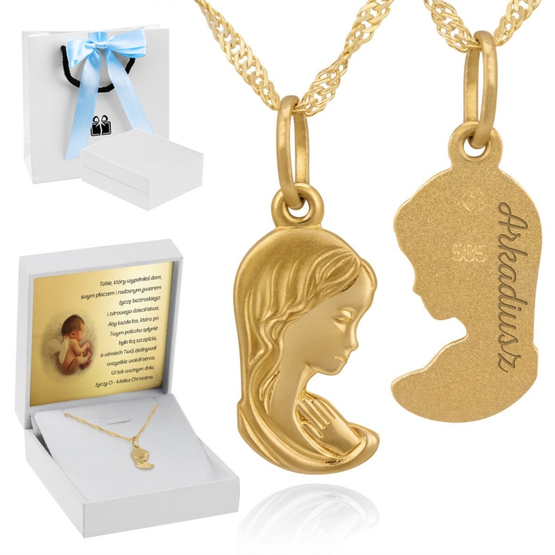 Komplet: złoty medalik z Matką Boską i łańcuszek pr. 585, grawer imienia lub daty oraz tabliczka w białym pudełeczku