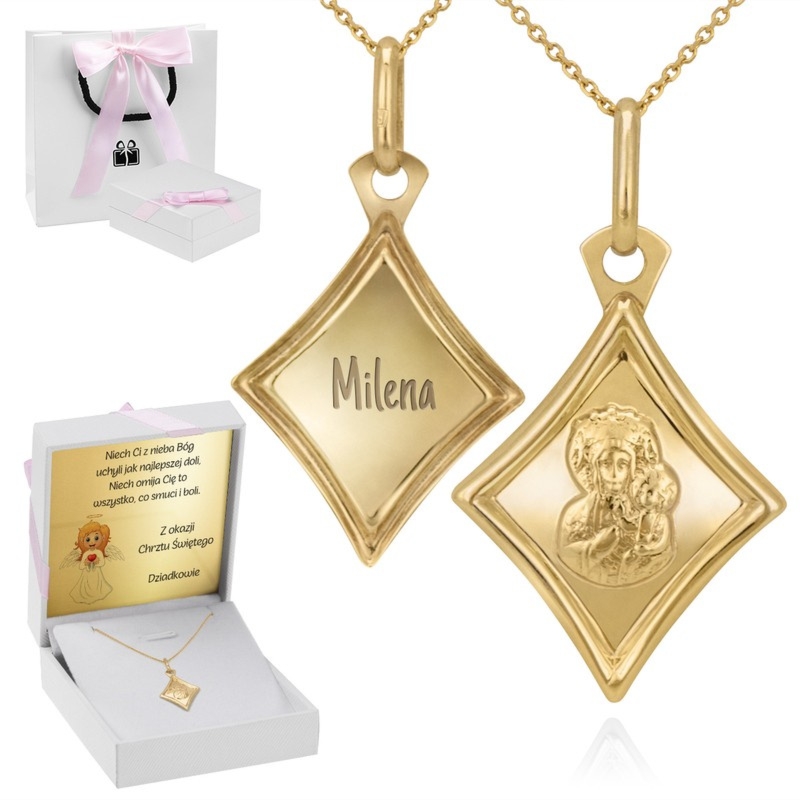 Rombowy medalik Matka Boska Częstochowska ze złota 585 z grawerem imienia i daty, w komplecie łańcuszek ankier i tabliczka z dedykacją