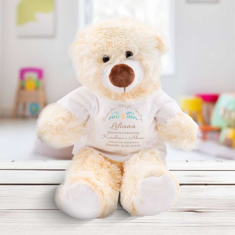 Pluszowy miś na Chrzest z koszulką i jednostronnym nadrukiem – personalizowana pamiątka Chrztu Świętego, idealna także od chrzestnych.
