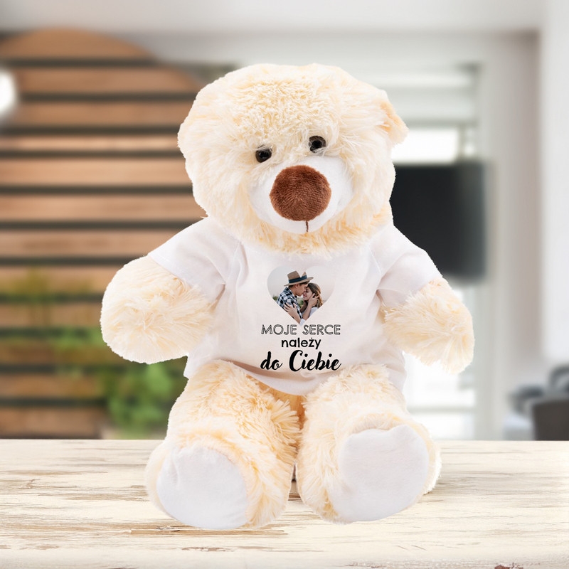 Co wyróżnia naszego misia? Na jego koszulce możesz umieścić własne zdjęcie, co sprawi, że prezent będzie naprawdę unikalny i osobisty. Dodatkowo, na koszulce znajduje się romantyczny napis „Moje serce należy do Ciebie”, który wyrazi Twoje uczucia w najpiękniejszy sposób.