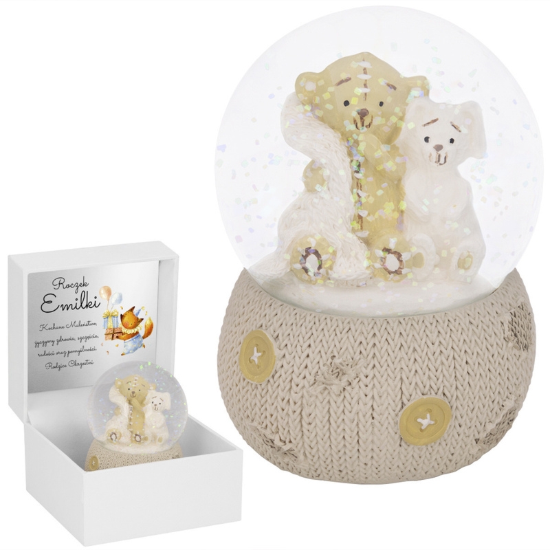 Kule śnieżne to piękna, klasyczna ozdoba, które ma wielu wielbicieli. Przedstawiamy państwu wyjątkową kulę śnieżną, w której znajdują się dwa misie. Po potrząśnięciu ozdobą, w środku zaczynają wirować różnokolorowe kawałki, co daje piękny, relaksujący efekt. Kula jest wykonana z najwyższej jakości materiałów, dzięki czemu całość jest trwała i bezpieczna. Grube szkło zapobiega pęknięciom, a podstawa wykonana z gipsu jest ozdobiona wzorem przypominającym sweterek z guzikami, dzięki czemu całość pięknie się prezentuje.