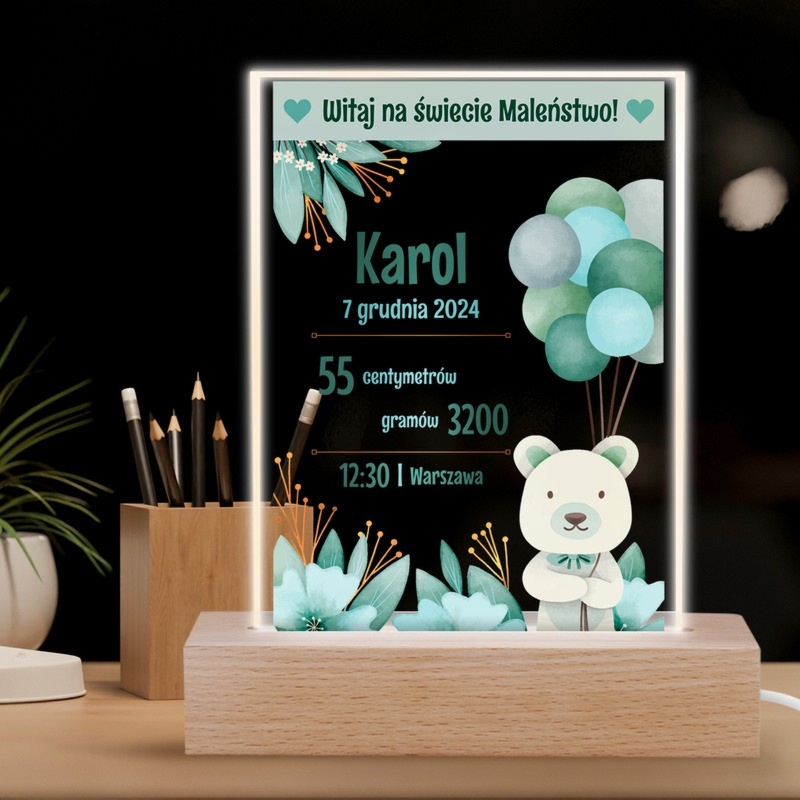 Akrylowa ramka LED na drewnianej podstawie z metryczką i zdjęciem dziecka oraz danymi: imię, data urodzenia, waga i wzrost