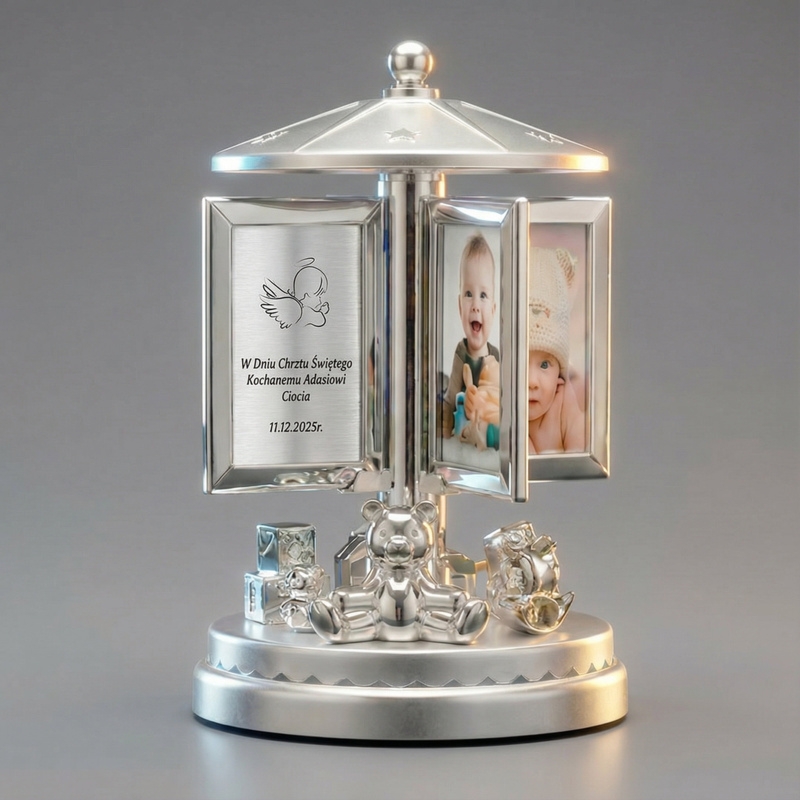 Duża posrebrzana karuzela z pozytywką na 7 zdjęć, z dedykacją na srebrnej tabliczce i melodią Twinkle Twinkle Little Star
