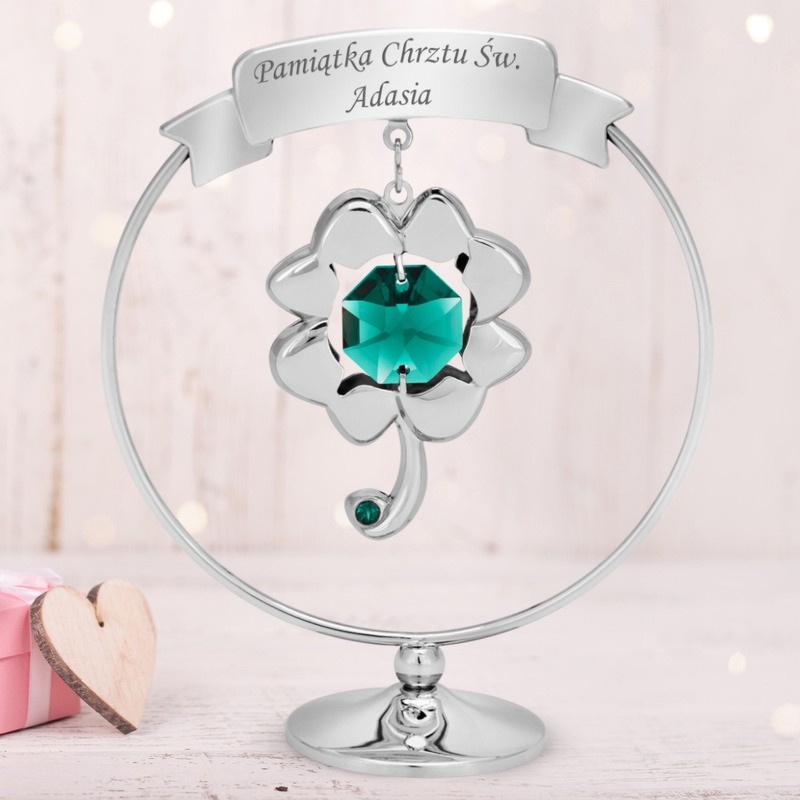 Metalowa figurka koniczyny w srebrnym odcieniu ze szmaragdowym kryształem Austrian Crystals i grawerem laserowym w zestawie z pudełkiem