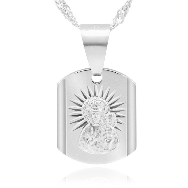 Ręcznie wykonany srebrny medalik 925 Matka Boska Częstochowska, diamentowany, z grawerem na rewersie: imię i data