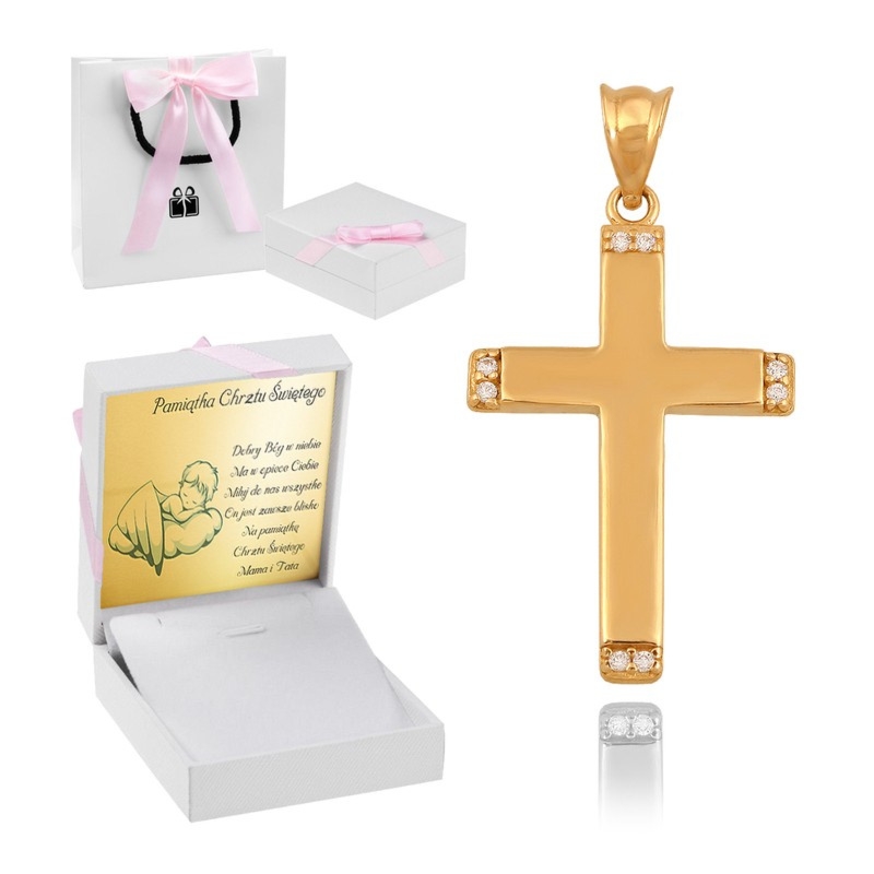 Złoty krzyżyk z cyrkoniami ze złota pr. 585 z personalizowaną tabliczką, białym pudełeczkiem z różową wstążką i torebką