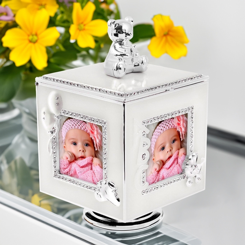 Posrebrzana karuzela-szkatułka z pozytywką, miejscem na 4 zdjęcia dodawane we własnym zakresie oraz pudełkiem