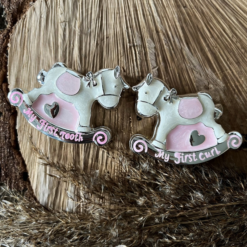 Dwie szkatułki-koniki na ząbek i pukiel włosów w szarym pudełku z białą wyściółką, z napisami od producenta i grawerem laserowym