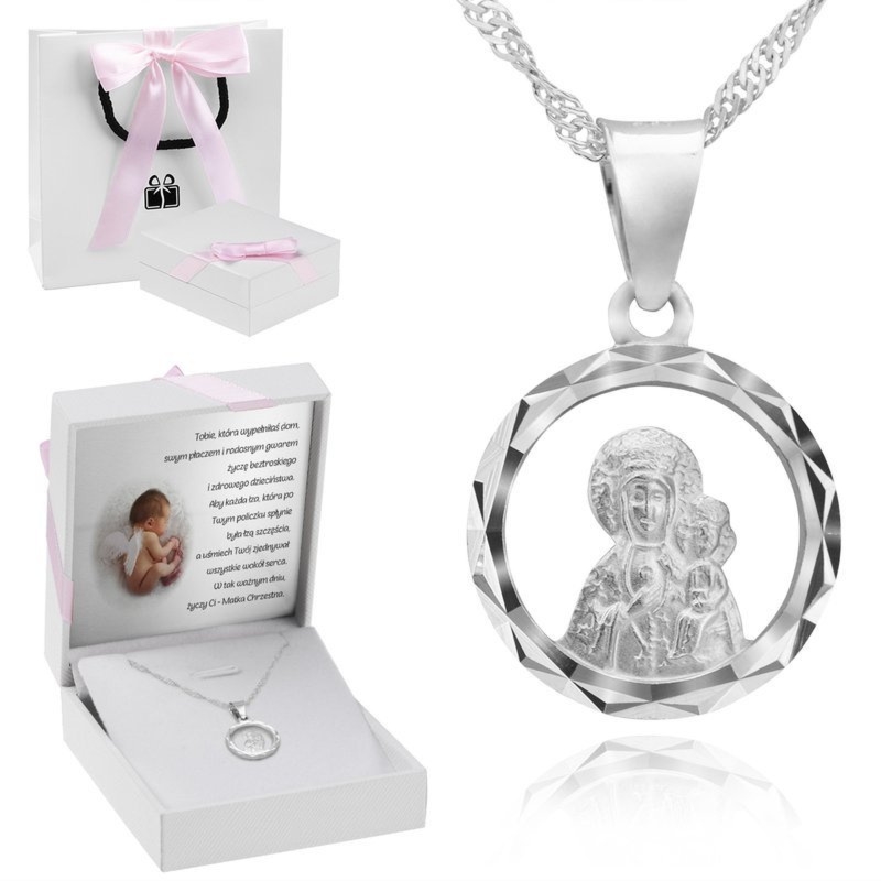 Srebrny medalik 925 z Matką Boską Częstochowską i łańcuszkiem Singapur, w pudełeczku z różową kokardką oraz tabliczką dedykacyjną