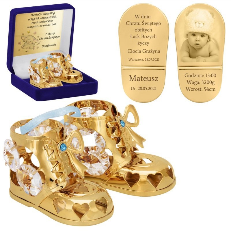 Buciki platerowane 24-karatowym złotem z kryształami, grawer na podeszwach obu bucików oraz tabliczka z indywidualną dedykacją