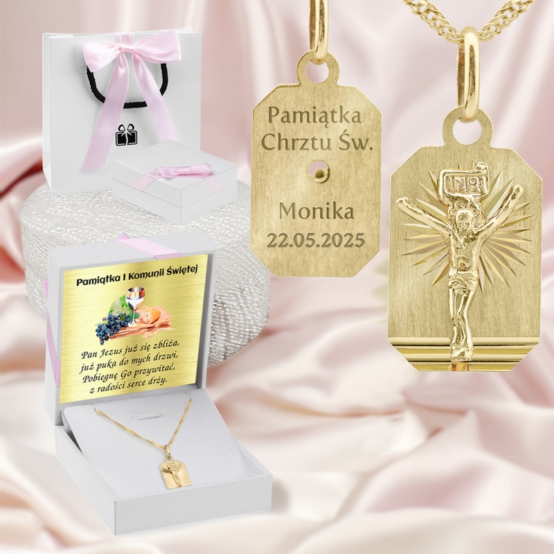 Złoty komplet pr. 585: medalik z Jezusem i łańcuszek singapur, grawer imienia i daty, pudełeczko z różową kokardką i tabliczka