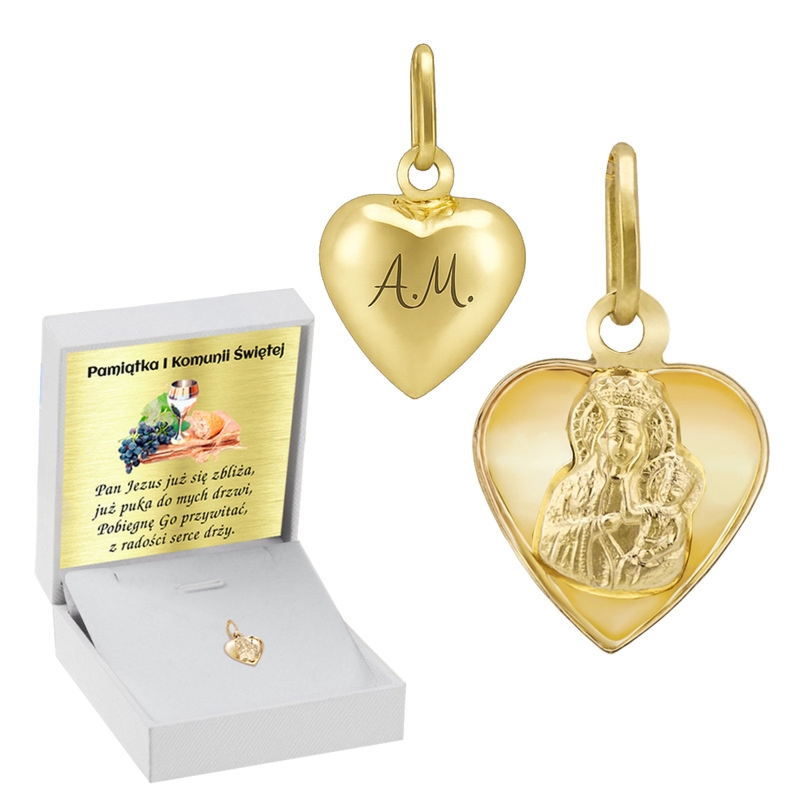 Złoty medalik serce 585 z Matką Boską i Dzieciątkiem, wypukły tył oraz grawer inicjałów na odwrocie, w zestawie tabliczka i pudełeczko