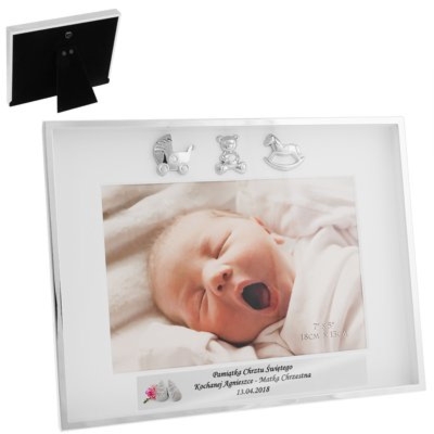 Posrebrzana ramka na zdjęcie z trzema ikonami i tabliczką z dedykacją, do postawienia lub powieszenia