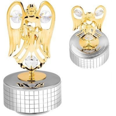 Pozłacany anioł na posrebrzanej podstawie, białe kryształki, melodia Its a Small World i grawer w cenie (do 70 znaków)
