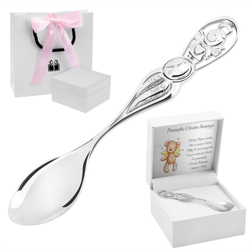 Srebrna łyżeczka próby 0,925 z grawerem do 100 znaków, z godziną na tarczy, wagą i wzrostem oraz tabliczką z dedykacją i etui