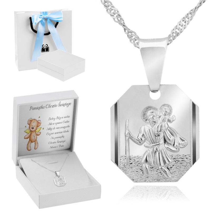 Srebrny medalik Święty Krzysztof 925 z łańcuszkiem Singapur w białym pudełeczku; w środku tabliczka z indywidualną dedykacją i torebka z niebieską wstążką