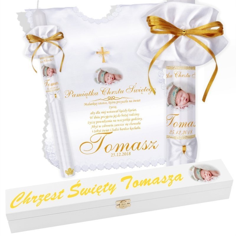 Zestaw na chrzest: świeca i szatka ze złotym haftem krzyża oraz biała skrzynka z nadrukiem UV; imię, grafika lub zdjęcie