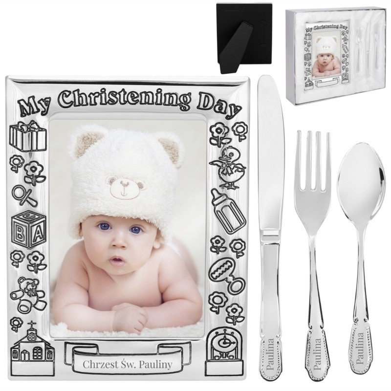 Zestaw na Chrzest: ramka na zdjęcie i sztućce ze stali posrebrzanej, personalizowany grawer laserowy na elementach, w ozdobnym pudełeczku