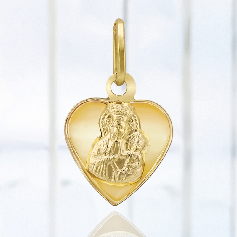 Ręcznie wykonany złoty medalik serce 585 z wizerunkiem Matki Boskiej z Dzieciątkiem i grawerem inicjałów na wypukłym odwrocie