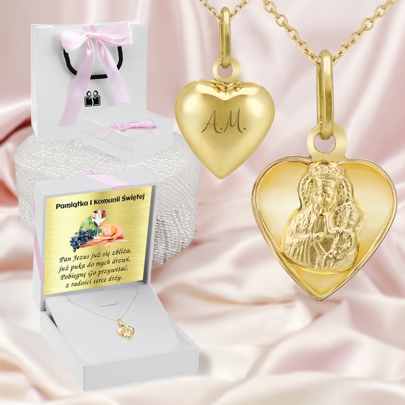 Zestaw: medalik serce 585 z Matką Boską i Dzieciątkiem oraz łańcuszek, grawer inicjałów, tabliczka dedykacyjna i pudełeczko z różową kokardką