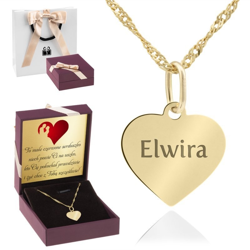 Wisiorek serce i łańcuszek singapur ze złota próby 585, z jednostronnym grawerunkiem i tabliczką z dedykacją, w pudełku i torebce
