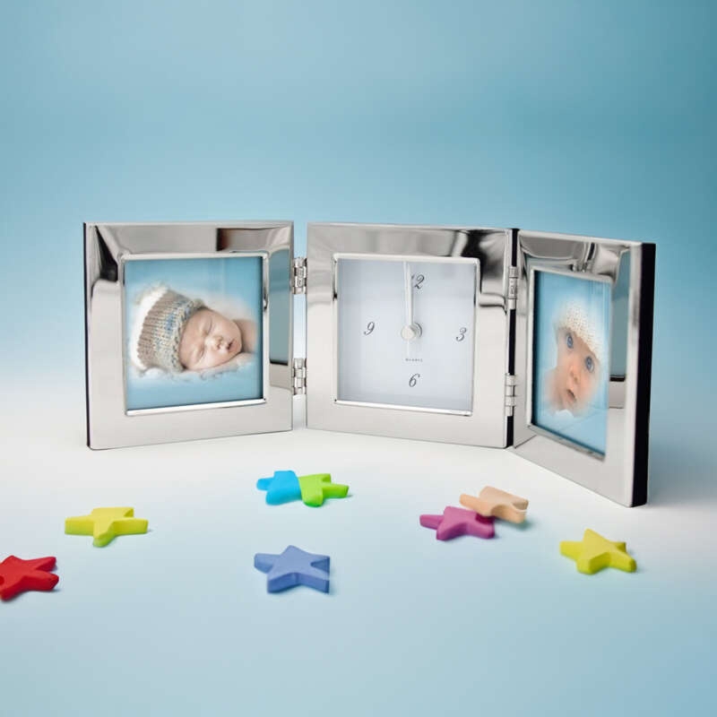 Zegar z dwiema ramkami na zdjęcia i indywidualnym grawerem nad zegarem, metal pokryty warstwą niklu, tył z czarnego weluru