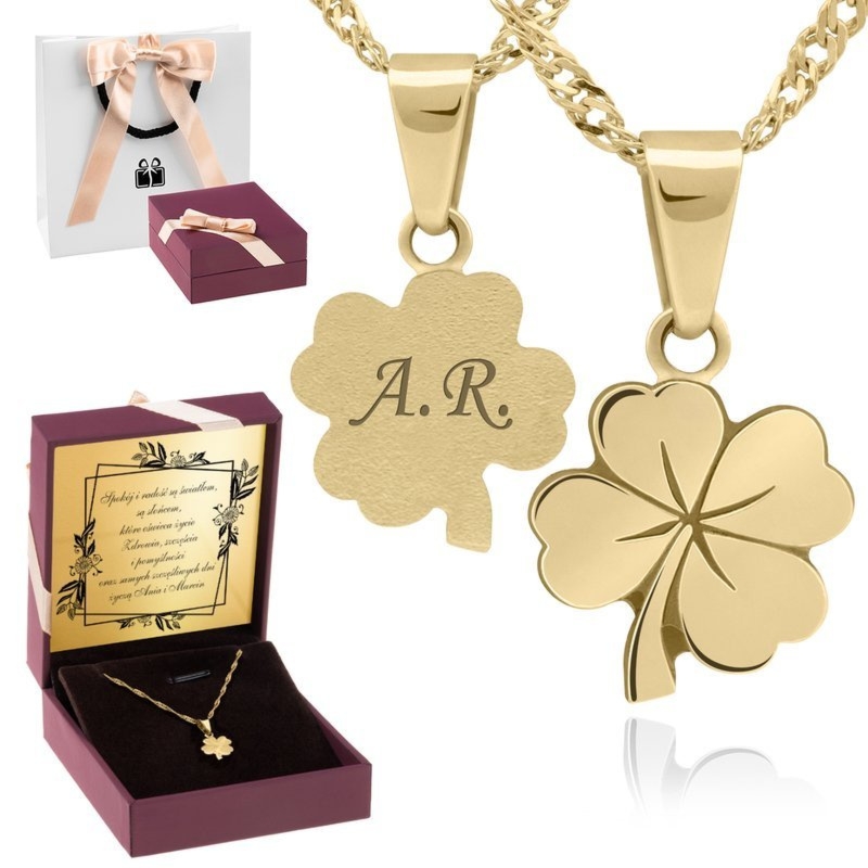 Wisiorek koniczynka i łańcuszek ze złota pr. 585 z grawerem inicjałów, tabliczką dedykacyjną, pudełeczkiem i torebką