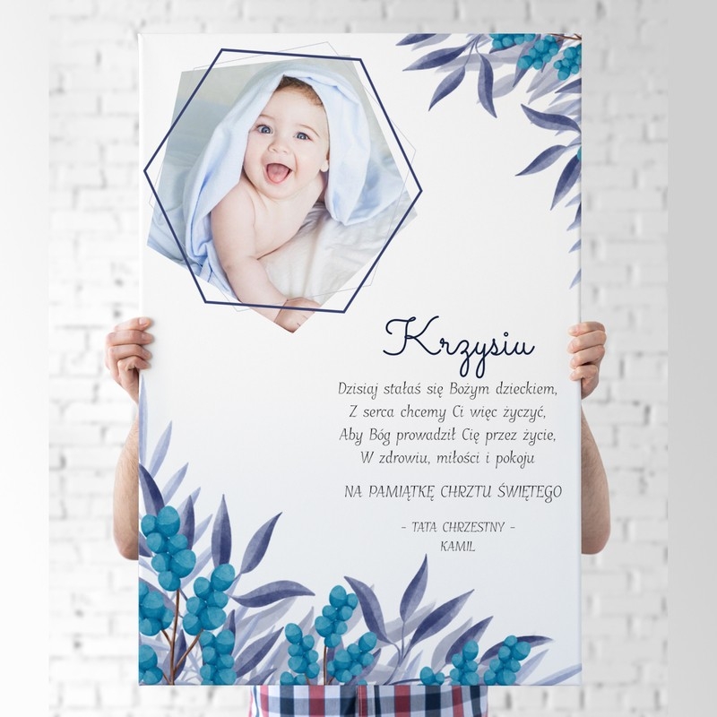 Przedstawiający projekt zawiera takie szczegóły jak zdjęcie dziecka w sześciokątnym ornamencie, wiersz oraz dedykacja, a po bokach granatowe kwiaty.