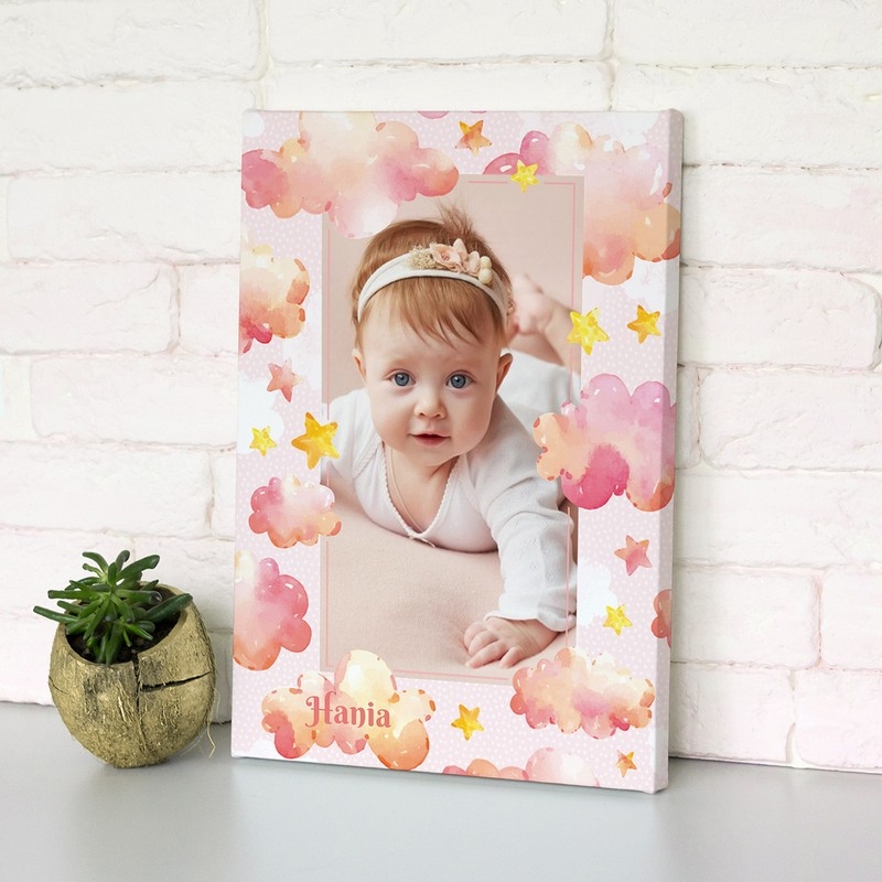 Obraz ze zdjęciem malucha i życzeniami skierowanymi specjalnie dla niego będą niezwykłą pamiątką na chrzest, roczek lub z okazji jego narodzin. Druk nanosimy na wysokiej jakości płótnie a następnie naciągamy go na krosna malarskie. Efekt finalny będzie prezentował się niesamowicie w każdym pokoju dziecięcym lub salonie.