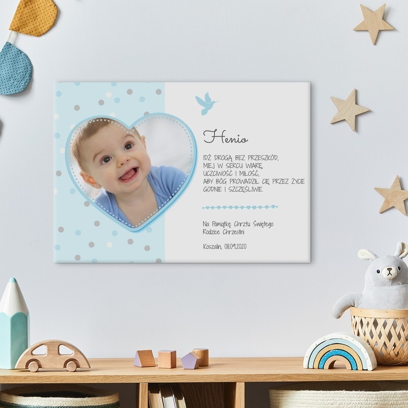 Napisz pierwszą opinię o „Obraz na chrzest zdjęcie w sercu dla chłopca 60×90 cm”