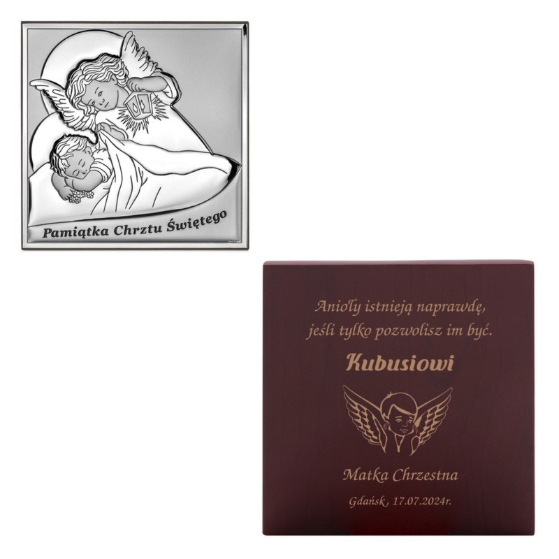 Obrazek posrebrzany / Obrazek Anioł Stróż/ Pamiątka Chrztu Św./ 13cm x 13cm/ Grawer