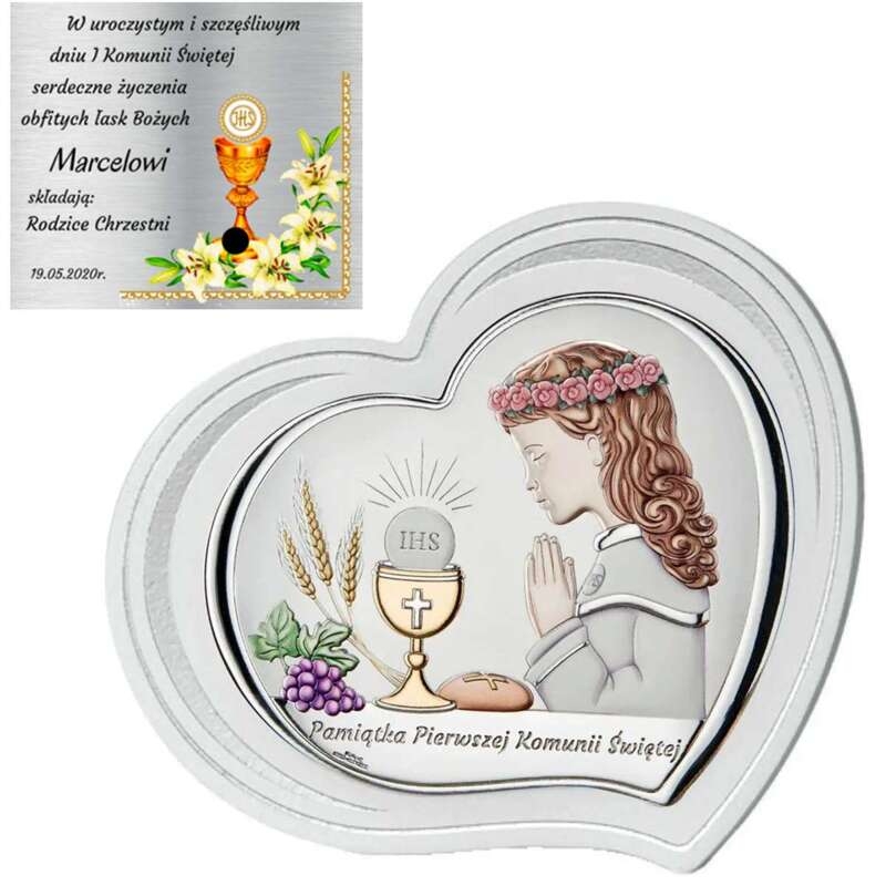 Obrazek srebrny na białym drewnie dziewczynka Grawer Pamiątka na I Komunia Św. z Dedykacją