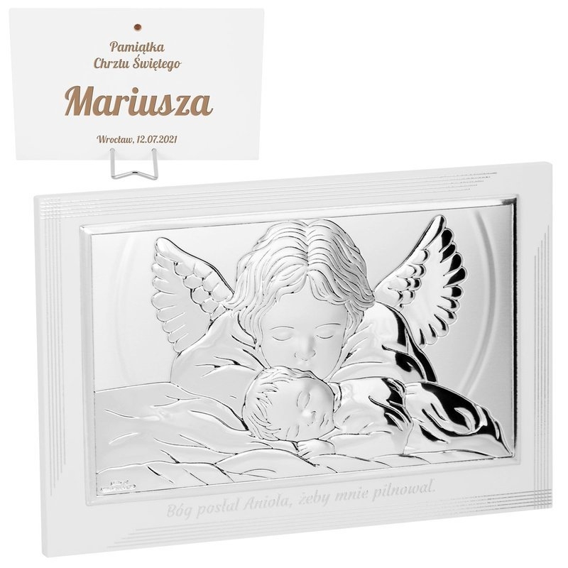 Przepiękny, posrebrzany obrazek, wykonany z największą starannością o każdy detal. Cały obrazek składa się z drewnianej, pomalowanej na biało podstawy, na której przytwierdzono posrebrzany wizerunek Anioła Stróża, czule całującego śpiące niemowlę. Dodatkowo ozdobiono go srebrnym obramowaniem. Na dole obrazka został umieszczony srebrny napis ” Bóg posłał Anioła, żeby mnie pilnował”. Postać Anioła Stróża budzi poczucie bezpieczeństwa, które z pewnością udzieli się dziecku. Obrazek z Aniołem Stróżem umieszczony nad łóżeczkiem dziecka, może stać się miejscem odmawiania pierwszej modlitwy.