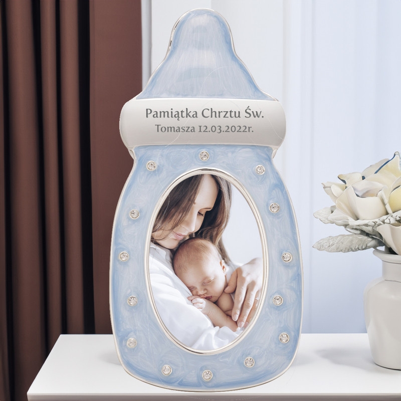 Błękitna ramka na zdjęcie butelka z cyrkoniami i grawerunkiem laserowym, wykonana z posrebrzanej stali i masy perłowej
