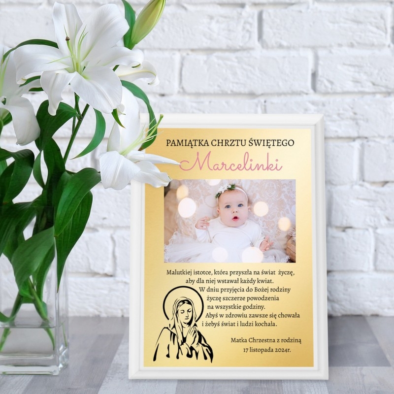 Biały drewniany podkład i złota tabliczka z miejscem na zdjęcie oraz personalizacją: imię dziecka, dedykacja i data Chrztu
