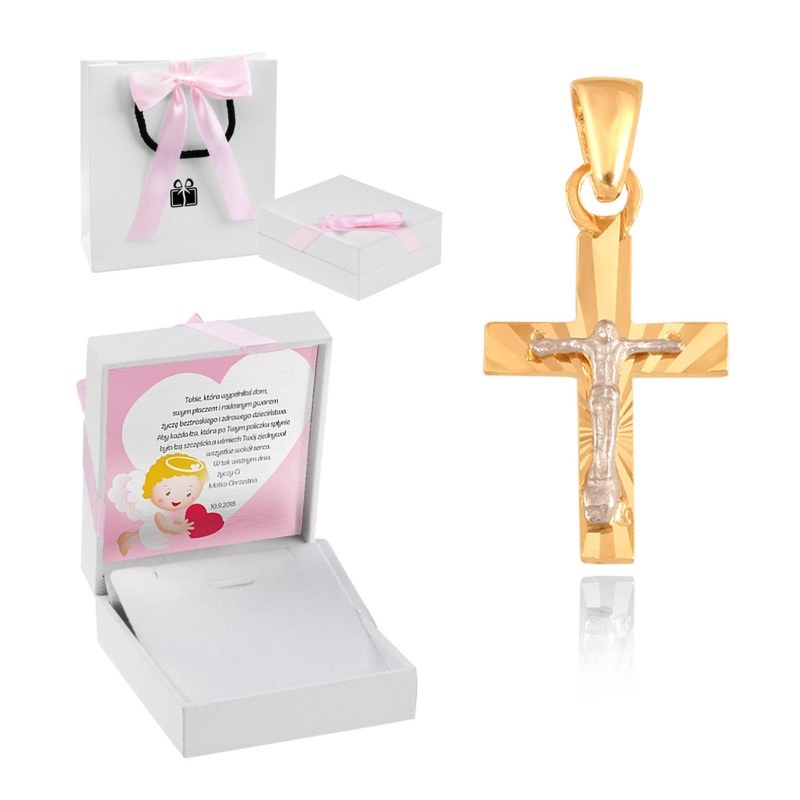 Złoty krzyżyk ze złota pr. 585 z tabliczką z personalizowanym nadrukiem i pudełeczkiem z różową wstążką oraz torebką prezentową