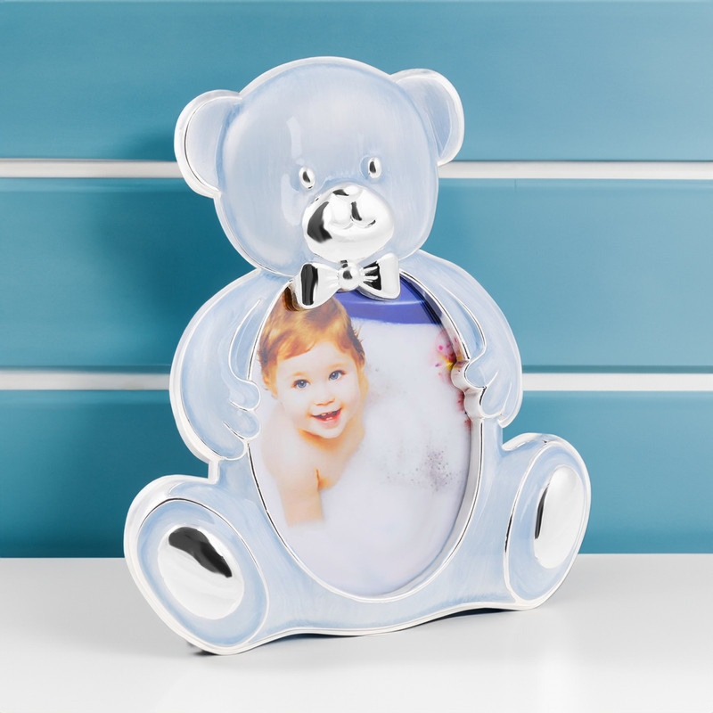 Posrebrzana ramka na zdjęcie Błękitny Miś z tabliczką z dedykacją z tyłu, do postawienia, na chrzest lub roczek