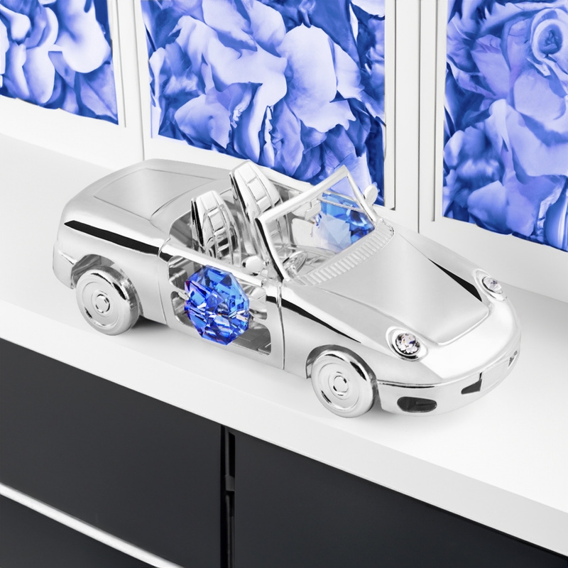 Samochodzik platerowany srebrem z 2 niebieskimi kryształami i kręcącymi się kołami, jako pamiątka na chrzest lub roczek