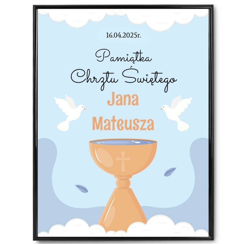 Personalizowany plakat na Chrzest z miejscem na imię dziecka, w czarnej ramce ze szklaną szybą. Gotowy prezent i pamiątka na lata