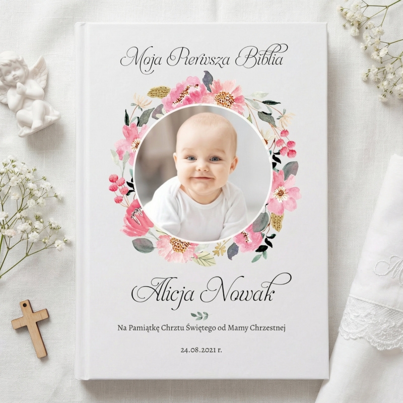 Biblia na chrzest dla dziewczynki z krzyżem i personalizacją: imię, cytat lub podpis, trwały nadruk UV i ilustracje