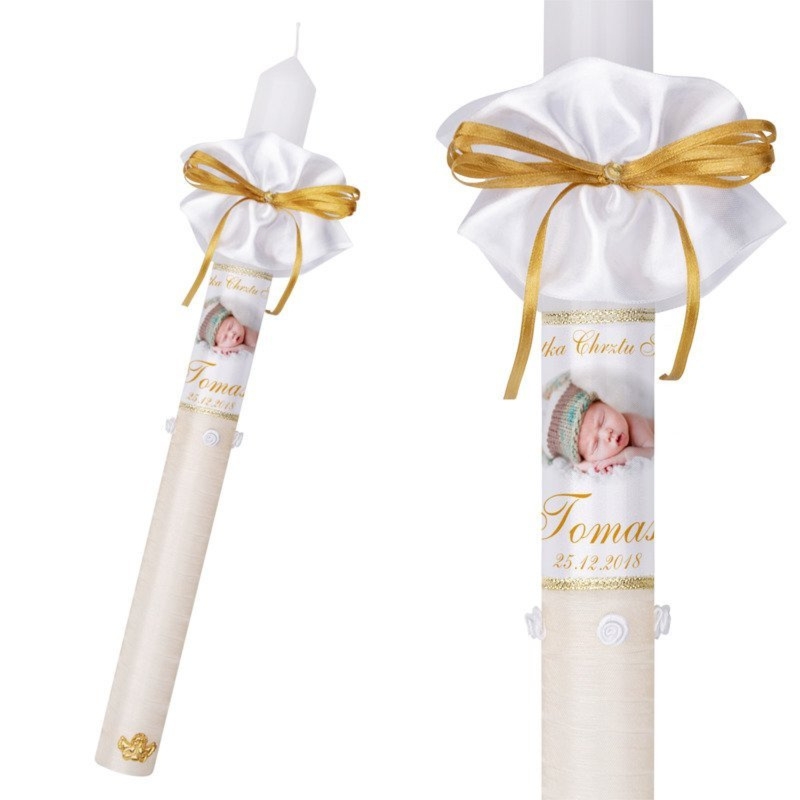 Ręcznie zdobiona świeca do Chrztu lub Komunii z nadrukiem zdjęcia lub grafiki i napisów, w zestawie profitka