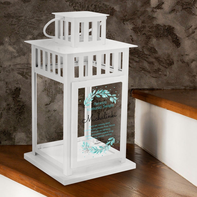 Subtelny biały lampion z personalizowanym nadrukiem to piękna i sentymentalna pamiątka Pierwszej Komunii Świętej. Na szklanej szybie umieszczono imię dziecka, datę uroczystości oraz krótki cytat lub dedykację – wszystko otoczone pastelowym wianuszkiem liści w odcieniach mięty i turkusu.