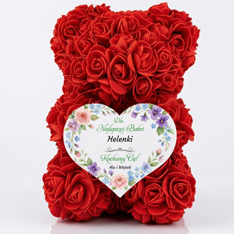 Personalizowany miś z czerwonych róż dla Babci ze zdjęciem wnuków