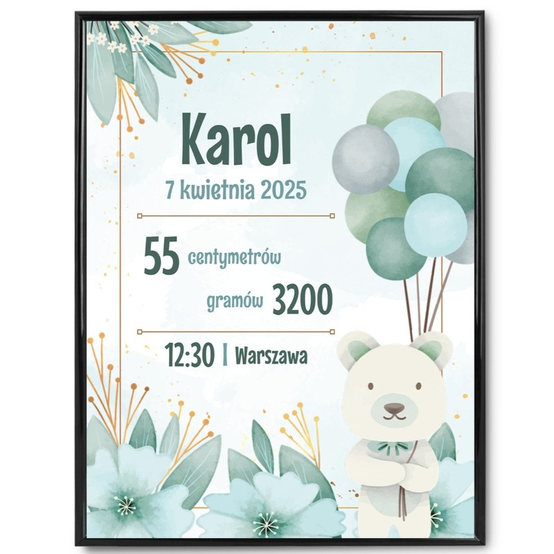Personalizowany plakat metryczka dla chłopca – miś z balonikami, ramka ze szkłem 40×30