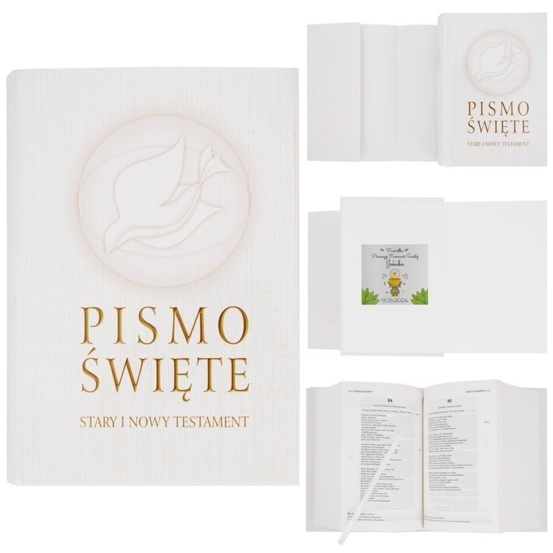 Pismo Święte Starego i Nowego Testamentu w twardej oprawie z metalową tabliczką z dedykacją na wewnętrznej stronie okładki