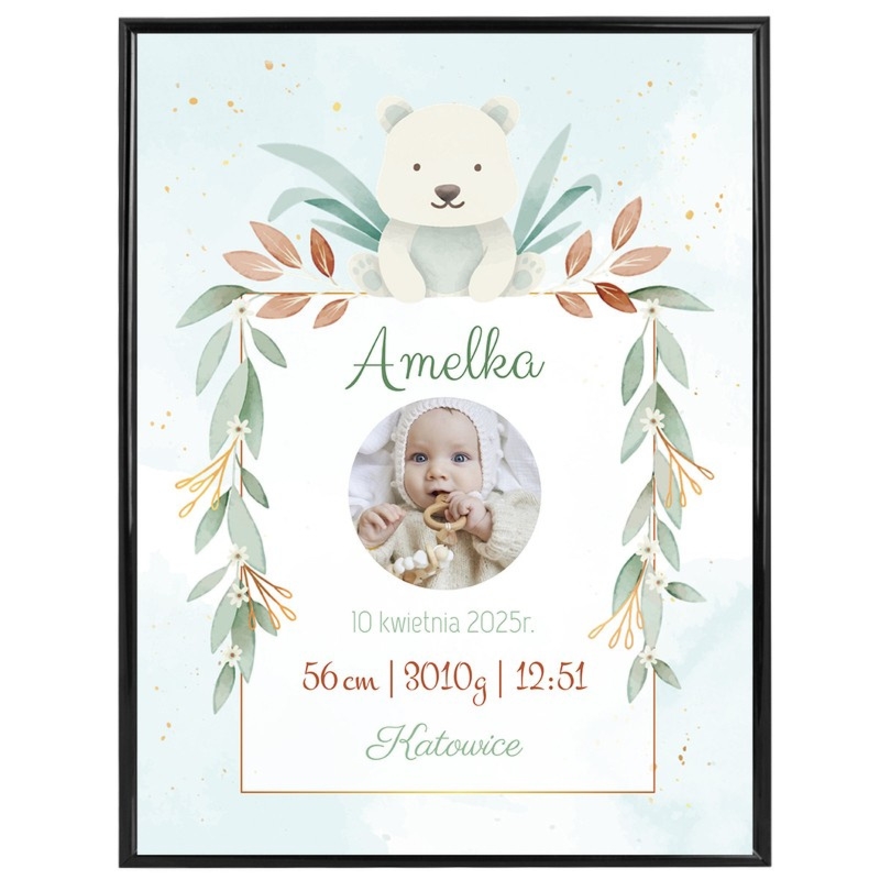 Metryczka ze zdjęciem i misiem dla dziewczynki, personalizacja danych (imię, data urodzenia, waga), w ramce ze szklaną szybą