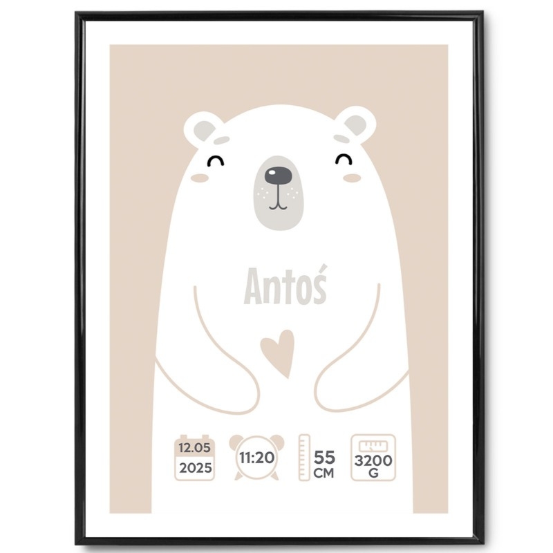 Personalizowany plakat metryczka na Baby Shower i narodziny: miś, dane dziecka (imię, data urodzenia, waga), ramka ze szkłem 40×30.