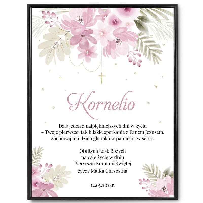 Proponujemy państwu wyjątkowy plakat, który stanie się piękną pamiątką Komunii. Piękna grafika w postaci delikatnych kwiatków sprawia, że plakat z pewnością spodoba się dziewczynce. W centralnej części plakatu znajduje się miejsce na imię dziecka, życzenia i podpis wręczającej prezent osoby. Dzięki prostemu i intuicyjnemu edytorowi na naszej stronie, z łatwością stworzą państwo swój projekt. Plakat umieszczamy w plastikowej ramce z płytą plexi, którą charakteryzuje wysoka przezroczystość i duża wytrzymałość na uderzenia.